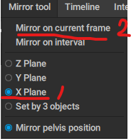 상단 메뉴에서 Mirror tool -> X Plane -> Mirror on current frame 을 순서대로 선택해줍니다.