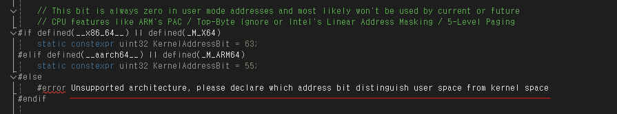 unsupported architecture, please declare which address bit distinguish user space from kernel space