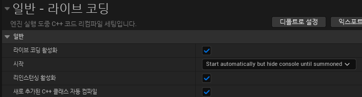 라이브 코딩 옵션은 이미 켜져있었지만 적용이 안되는걸 보니 직접 실행해줘야 하는 듯 합니다.