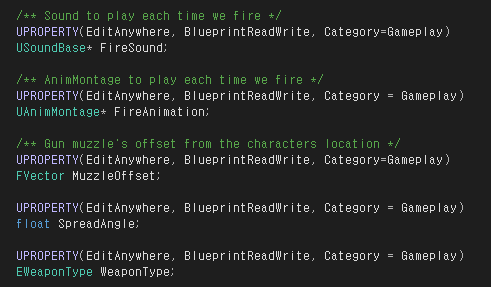 - 지정자를 추가하여 다양한 기능을 적용할 수 있습니다. (EditAnywhere, BlueprintReadWrite 등)