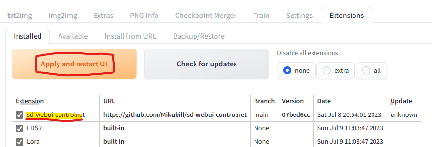 sd-webui-controlnet을 확인해주신후 Apply and restart UI 버튼을 클릭해줍니다.