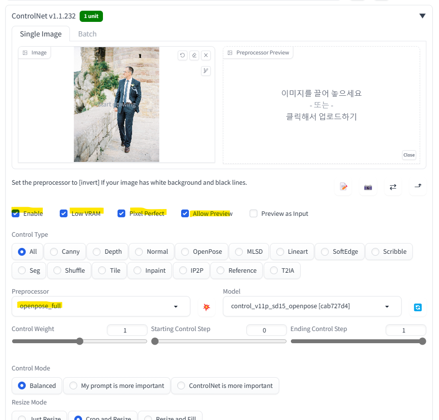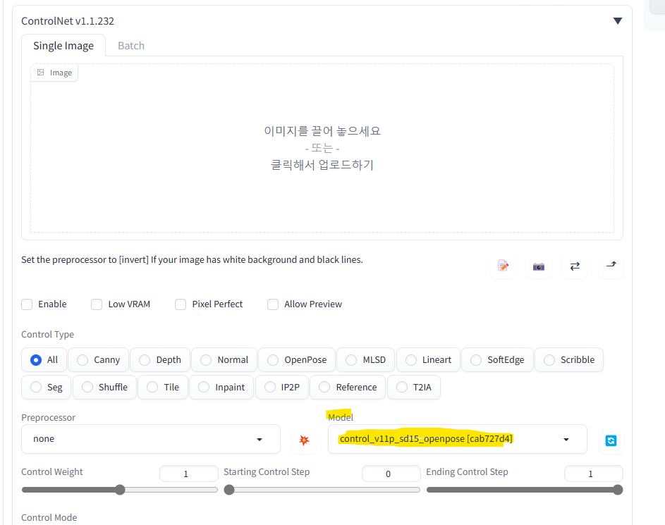 Model 탭에서 openpose 관련 항목이 확인되시면 성공입니다.