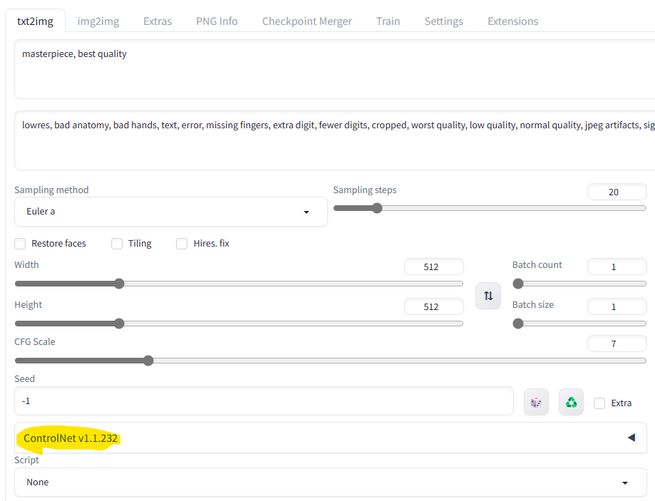 그리고 txt2img로 가보신 뒤 ControlNet 드롭다운 메뉴가 보인다면 성공입니다.